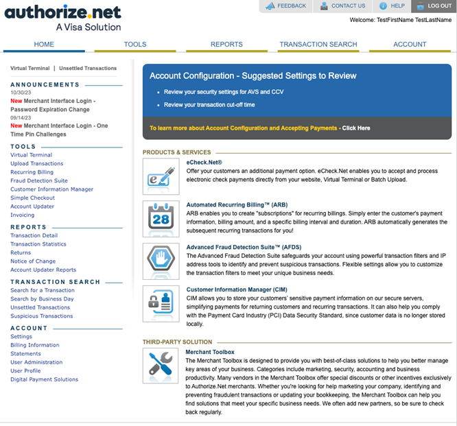 This is the home page for Authorize.net. From here you can navigate to any page or tool you need.