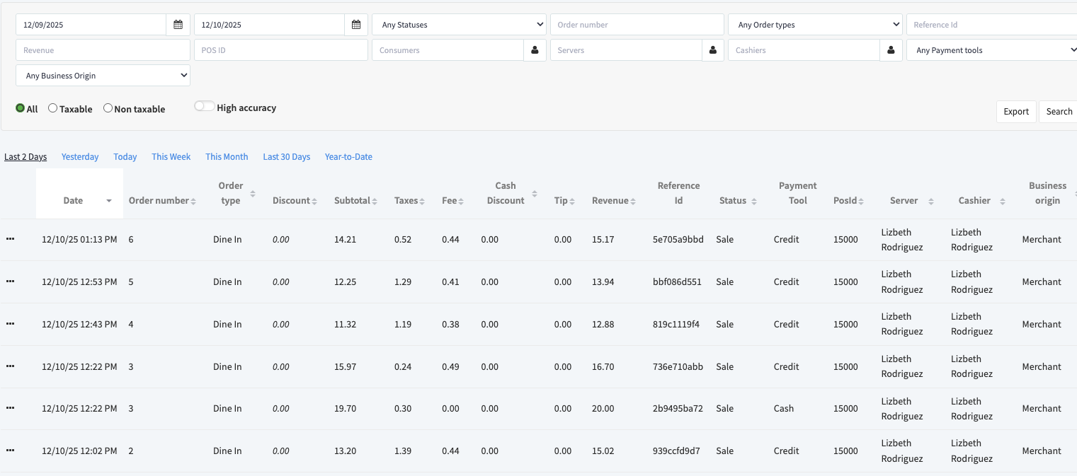 Sales History has a list of all sales taken on the Register. At the bottom of the page is shows to total sales, tax and tips collected for the time frame that is referenced.