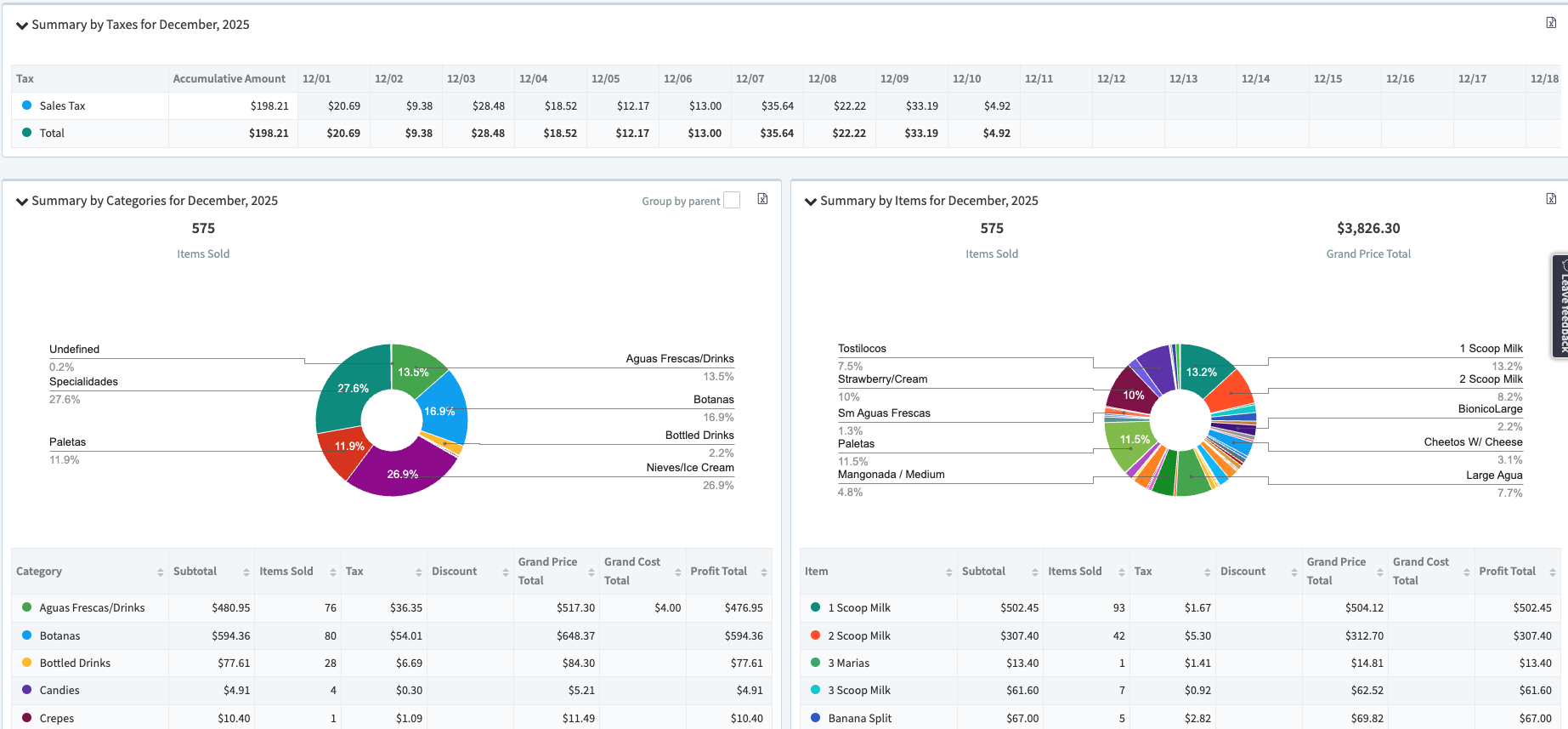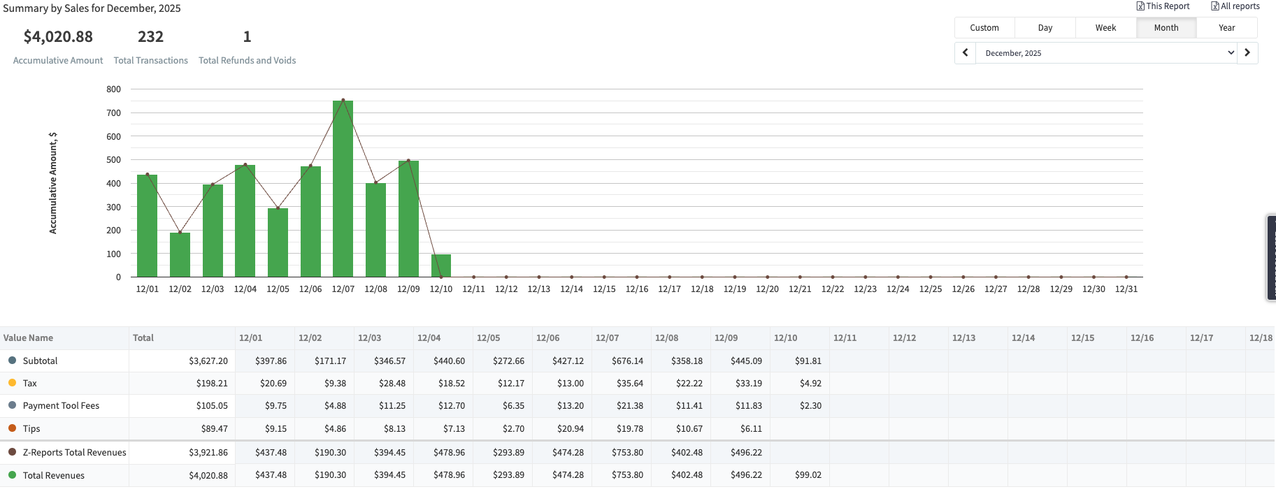 Sales history, Goods History, and Summary Page will have most reports merchants are looking for.