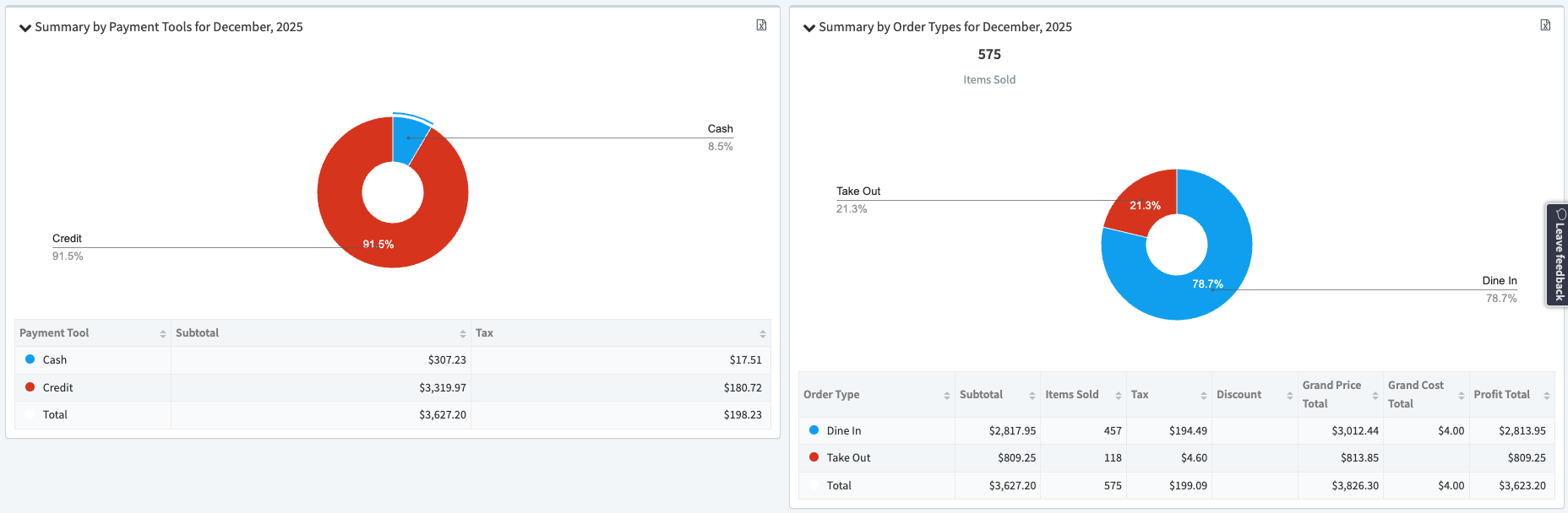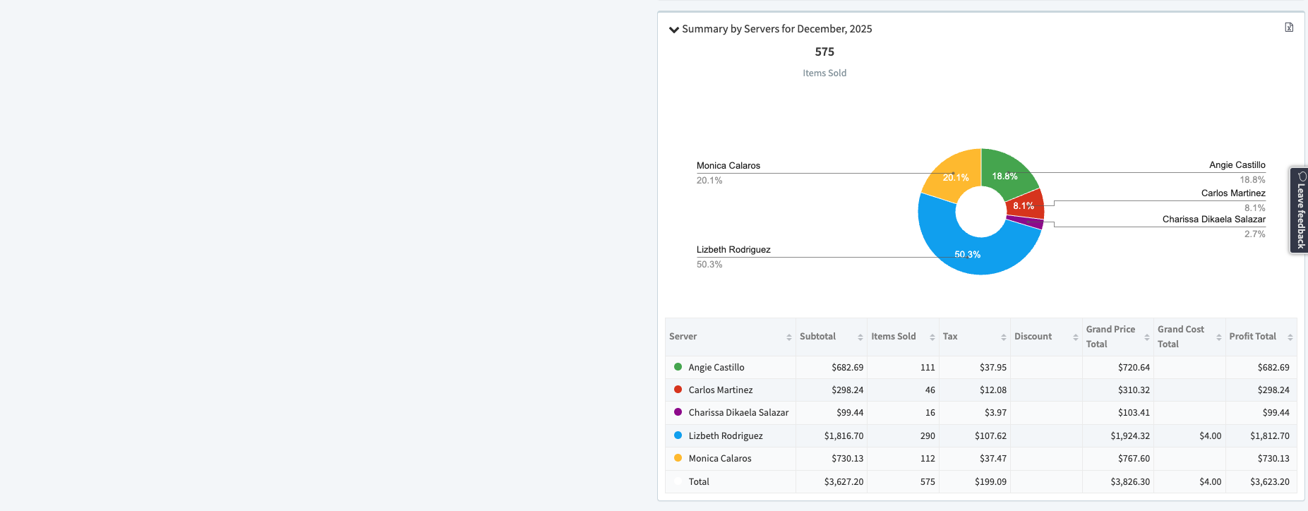 The Summary Page shows a breakdown of all Sale, Tips, Taxes, Items and Employee Sales for the Date range selected. This is the most robust report of the three, and will be the most useful.
